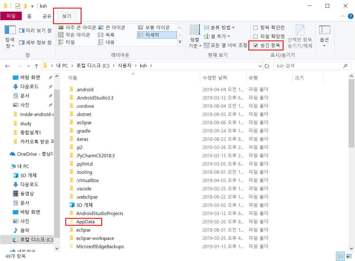 그 다음, 보기 탭을 눌러 숨긴항목을 체크해준다. 그러면 아래와 같이 AppData Folder를 찾을 수 있다.